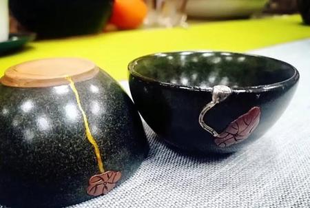 金缮是一种非常古老而优美的技艺,是将破碎的器皿用天然生漆黏起来,再用金粉、金箔在表面涂抹,描绘出新的艺术美感。这样的方法,比较适合破碎了一小片的器皿,比如题主的这枚白色玉杯,或者裂了一两条口子也可以修补,但右边的青色小杯就不太适合了。