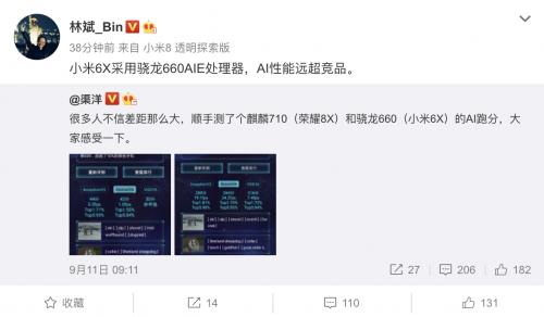 因此,微博认证知名数码博主渠洋亲自做了一个关于小米6 X和荣耀8 X的AI跑分的测试,并在微博上公布出来,力挺小米。随后,林斌也转发了这条微博。