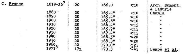 是的,在拿破仑那个时代,法国人一米七,真的不算矮子!事实上在18世纪末至19世纪初,法国人的身高,平均也就只有165公分左右!下图,是法国从1819年到1971年的征兵平均身高记录:
