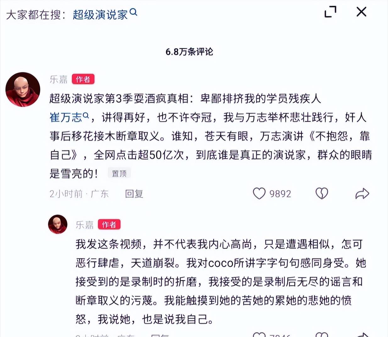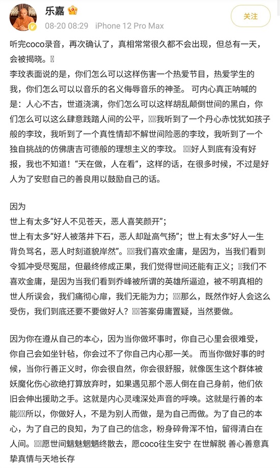 作为一位多才多艺的主持人,乐嘉不仅有丰富的主持经验,还写有书籍,并举办心理学讲座。因此,他发表的长文极富文采,内容和措辞都经过精心考究。