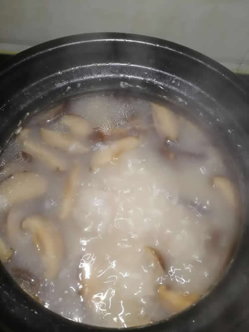 大米煮至开花 ,就倒入炒好的香菇和鱿鱼,加入姜片继续小火熬煮,汤水已经很浓郁了