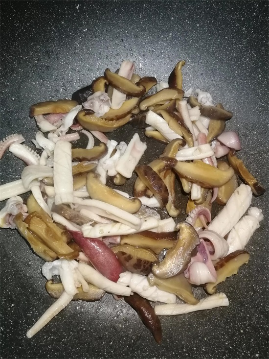 把泡发好的香菇切片,鱿鱼干撕去红皮然后切条状,热锅下油,把鱿鱼干和香菇先翻炒一下