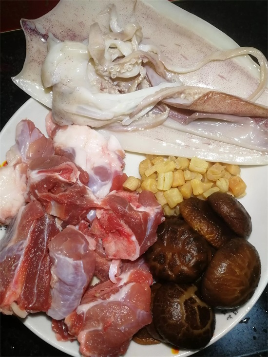 鱿鱼干提前2-3个小时用清水泡发备用,干香菇也是同样用温水泡发3-4小时,瑶柱用姜水浸泡半小时,猪骨洗干净后焯水备用