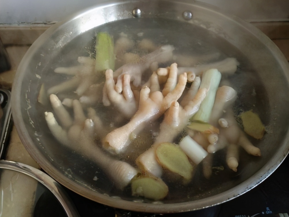 2、一小时,以后把鸡爪捞出来,接着锅烧清水,将鸡爪直接冷水下锅,水开后撇去多余的浮沫,然后再放上葱姜料酒,精盐鸡精味精,去腥调味。