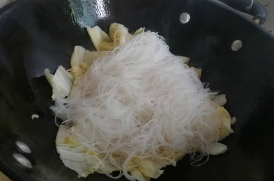 待白菜炒至五成熟时,倒入粉丝,继续用中火炒,需要不停地翻动,防止粘锅。