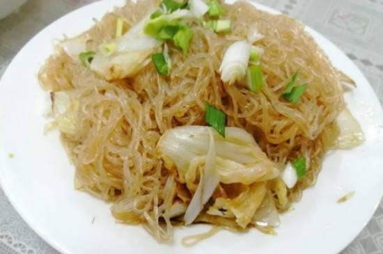 最后出锅,将炒粉丝盛至盘内,撒上葱花,粉丝就炒好。