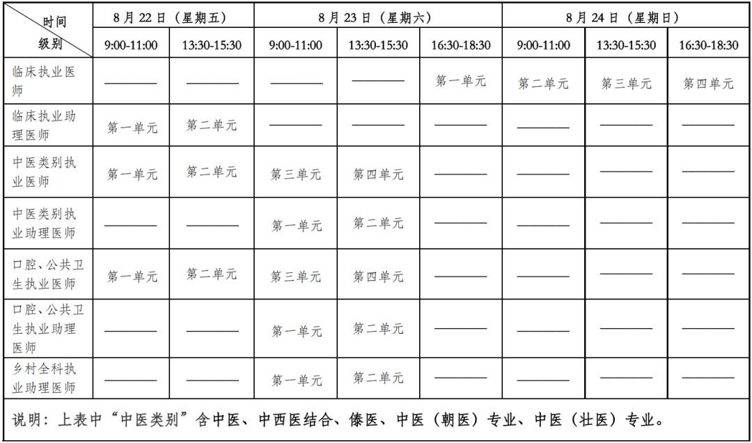 执业医师合格分数线为360分,执业助理医师合格分数线为180分。考试时间如下: