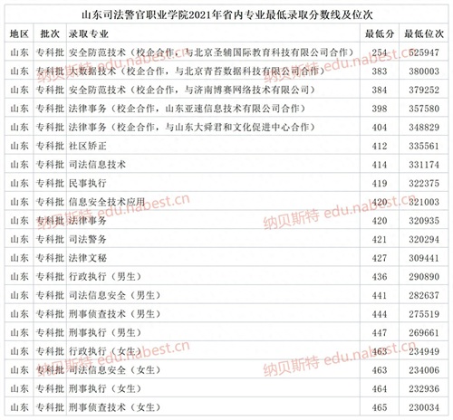 山东司法警官职业学院2021年省内专业最低录取分数线及位次