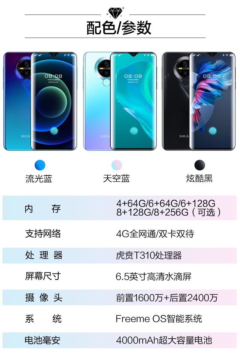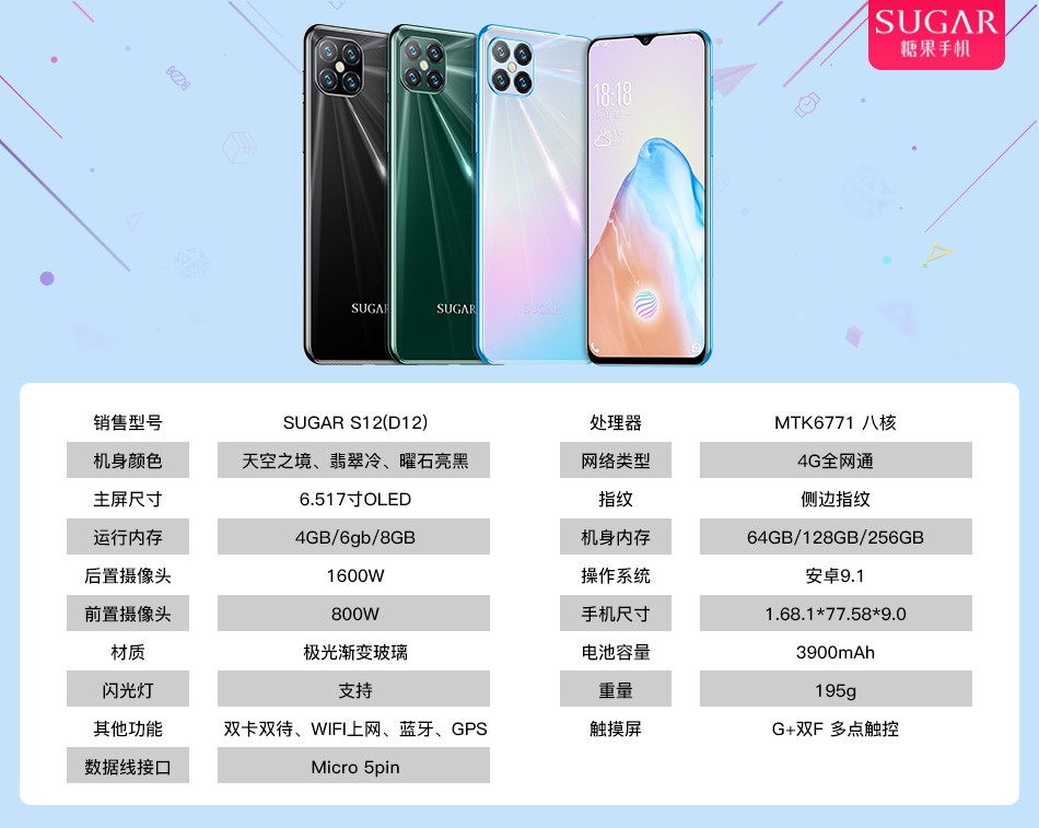 糖果S12,mtk6771处理器,外观山寨reno4se,6.5寸OLED屏,侧边指纹,后置1600万前置800万,安卓9.1 ,USB2.0充电接口,8+128售价1299元。