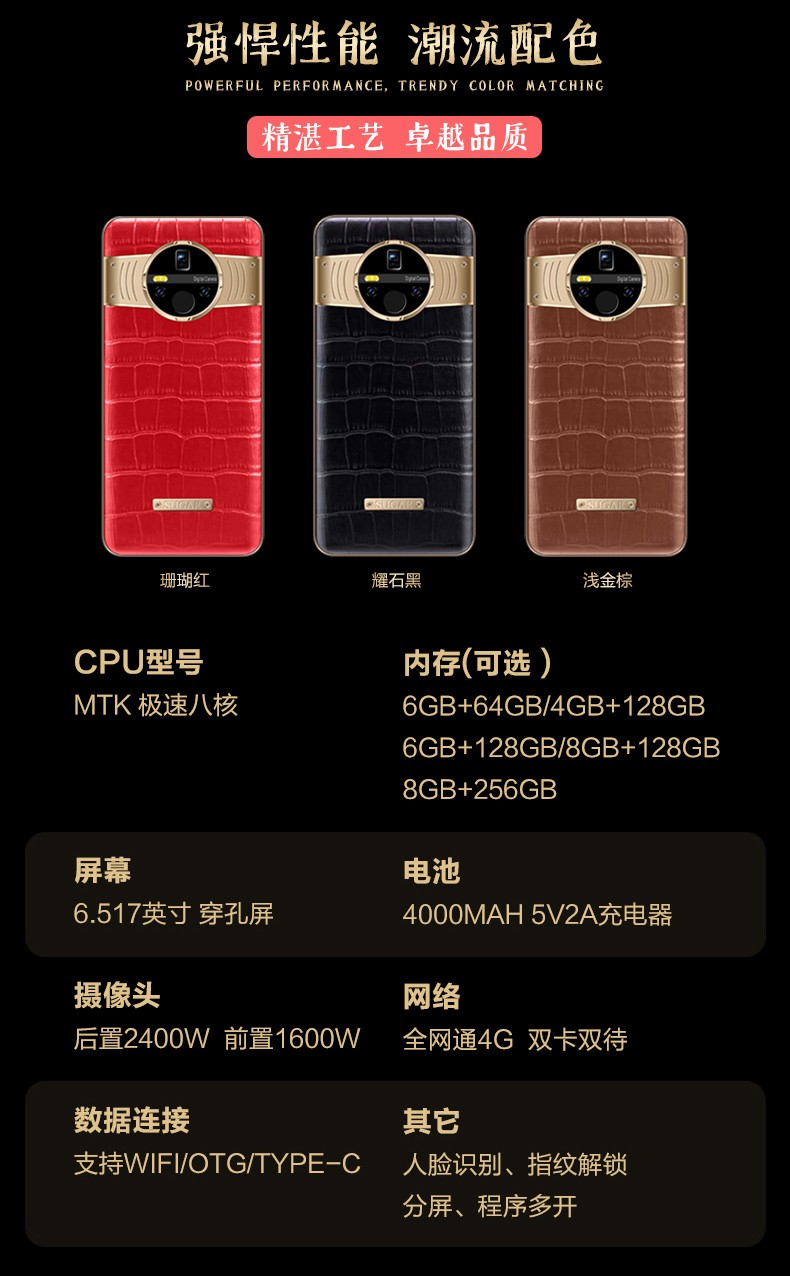 糖果m40pro,外观山寨华为mate40pro保时捷定制版,mtk6771处理器,6.5英寸OLED屏,60000:1的对比度,后置1600万前置808万,安卓9.1,一卢充电,售价3999。
