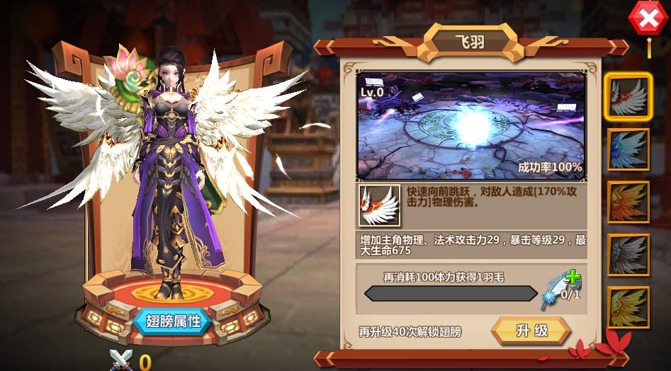 飞羽:增加主角物理、法术攻击、暴击等级、最大生命值