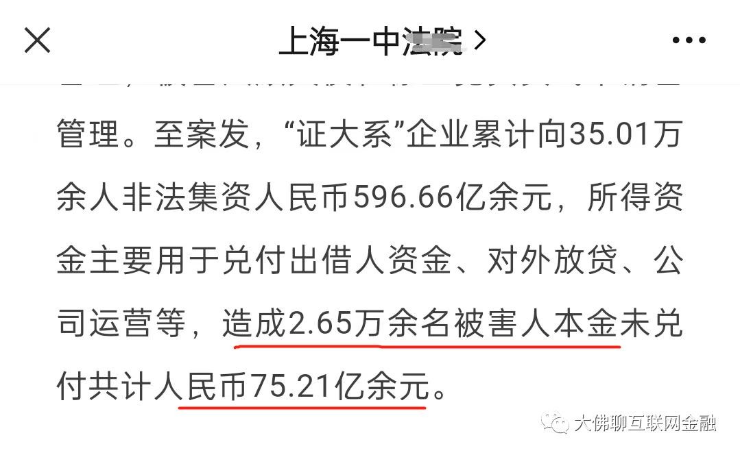 据一审公布情况,证大系企业累计向35万人非法集资596.66亿元,最后造成2.65万被害人本金未兑付75.21亿元。