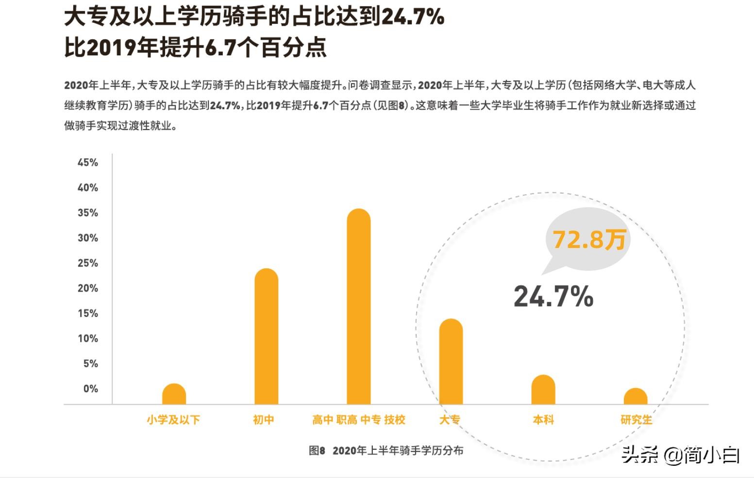 美团发布《骑手就业报告》,展示了外卖行业的就业和收入状况。截止2020年上半年(6月30日)美团拥有外卖骑手295万;超过一半的骑手学历是初中和高中,四分之一的骑手学历在大专以上,其中本科生17万,研究生近6万人。