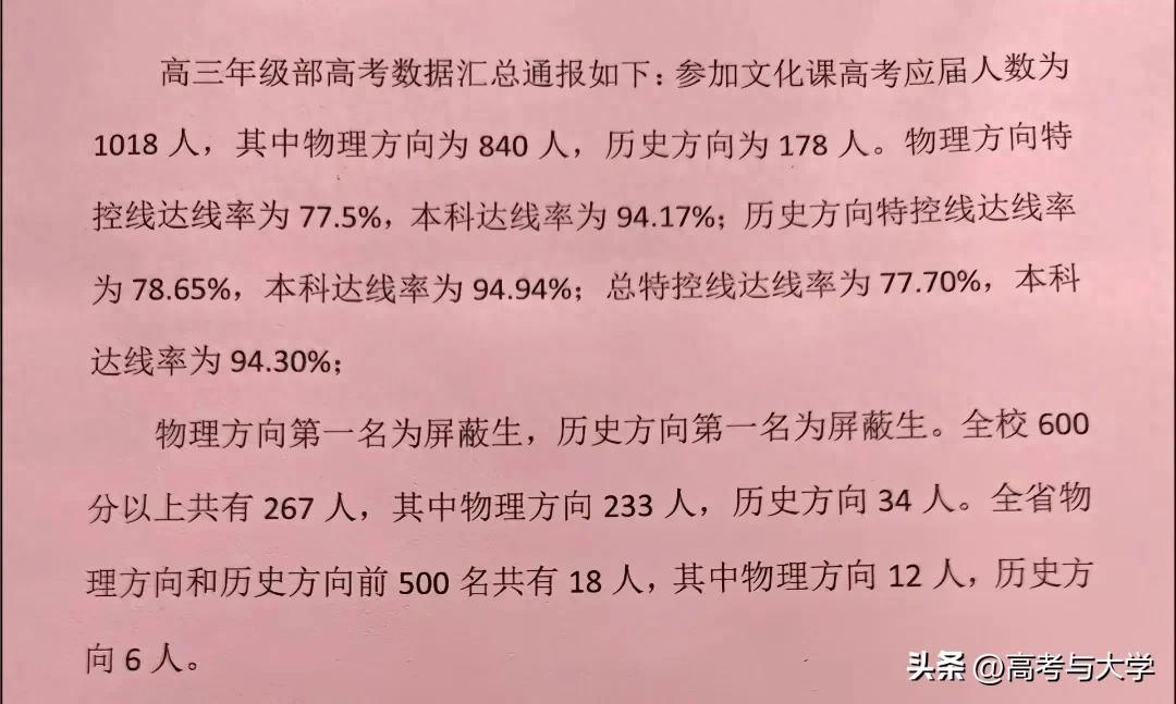 郎溪中学2024年高考成绩优异,参考人数1018人,600分以上267人,物理类233人,历史类34人,屏蔽生2人,特控率达77.7%,本科上线94.30%。