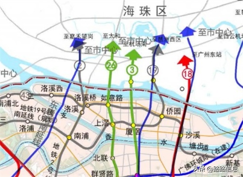 规划的地铁线路有3条,分别是地铁26号线、地铁19号线、地铁43号线,规划地铁站5座,分别是洛溪西、洛溪桥、如意路、上滘、侨园。其中如意路站为26号线和43号线换乘站,上滘站为26号线和19号线换乘站,侨园站为19号线和43号线换乘站。另外,现状3号线厦滘站与规划19号线换乘,18号线沙溪站与规划43号线换乘。洛溪岛最新地铁规划图如下: