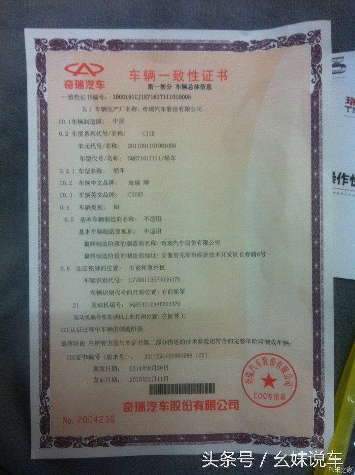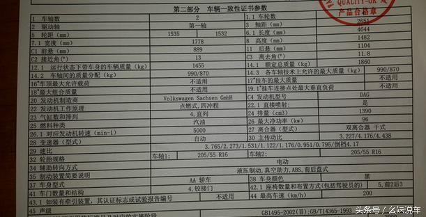 该证书主要是对车辆一致性进行认证的,内容上对车辆的一些技术参数进行定义,车主有心的话买车后对该证书拍张照片留底,对今后的维修保养都有很大帮助。