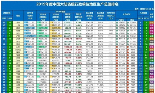 2019中国大陆各省级人均GDP排名
