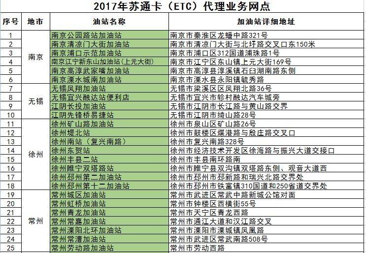 为满足ETC苏通卡用户的便捷充值需求,中石化江苏公司61个加油站新增苏通卡充值服务。即日起,以下加油站受理苏通卡的充值业务: