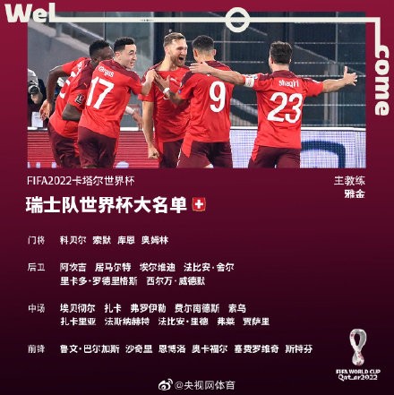 11月9日,瑞士国家队公布了世界杯26人大名单,扎卡、索默、沙奇里领衔,阿坎吉、扎卡里亚、弗罗伊勒等名将悉数入围。本届世界杯,瑞士与巴西、喀麦隆、塞尔维亚同在G组。