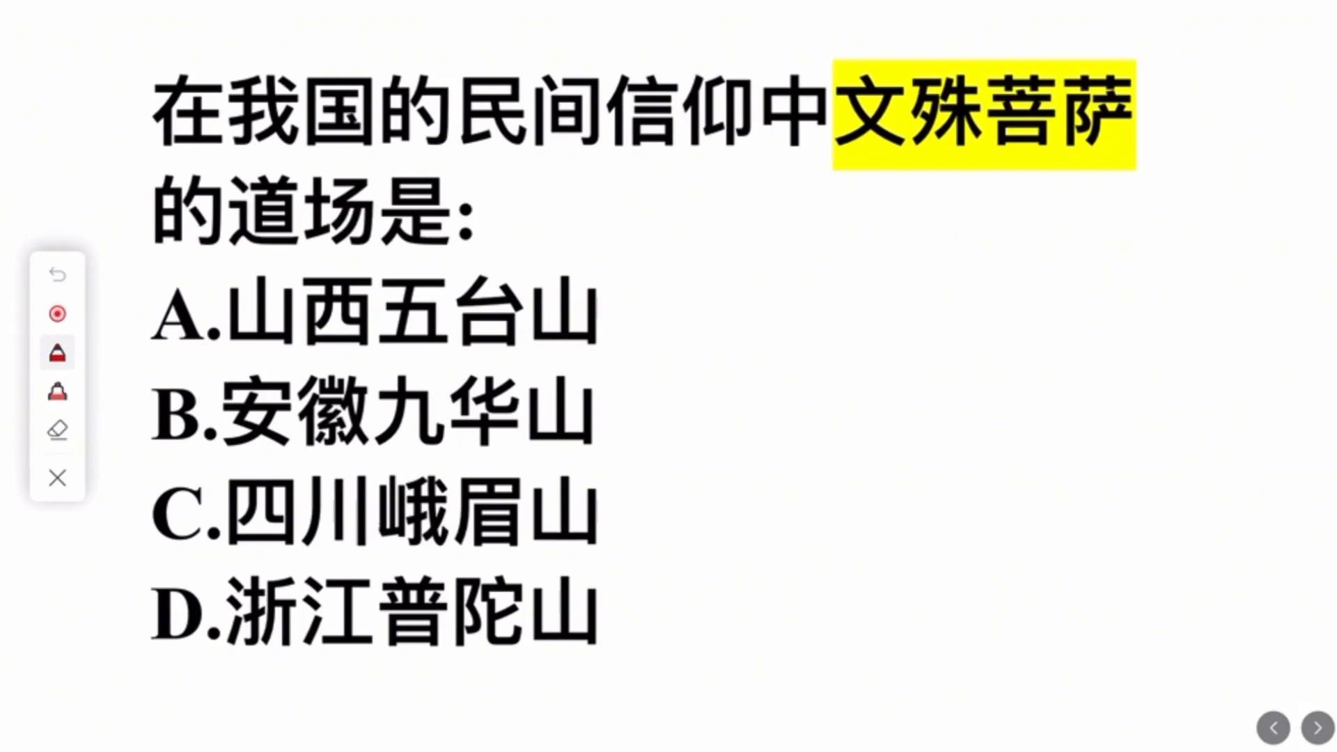 各位同学,你们好。今天来看这样一道题目:在我国的民间信仰中文殊菩萨的道场是以下哪一个地方?A.山西五台山;B.安徽九华山;C.四川峨眉山;D.浙江普陀山。