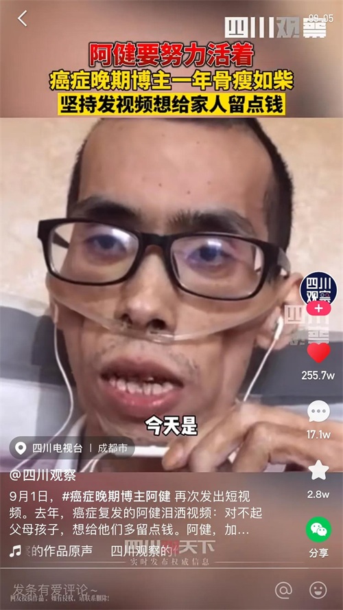 大家知道抖音上有一个名叫“阿健”的小伙子,每次的开场白也是“大家好,我是阿健”由刚开始一个看似健康的小伙子到最后临终前的瘦骨嶙峋。最后,虽然他很留恋这个世界,很留恋年幼的孩子,年迈的母亲和一直不离不弃的妻子,可最终他的生命定格在9月9日这个普通而平凡的日子。导致阿健去世的原因就是大家熟悉而又觉得离自己很远的疾病“直肠癌”。