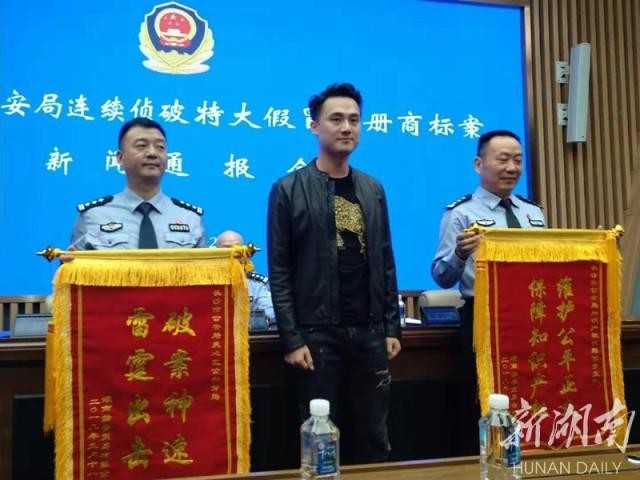 在新闻发布会现场,惠普公司、碧缇福公司负责人向长沙警方赠送锦旗。