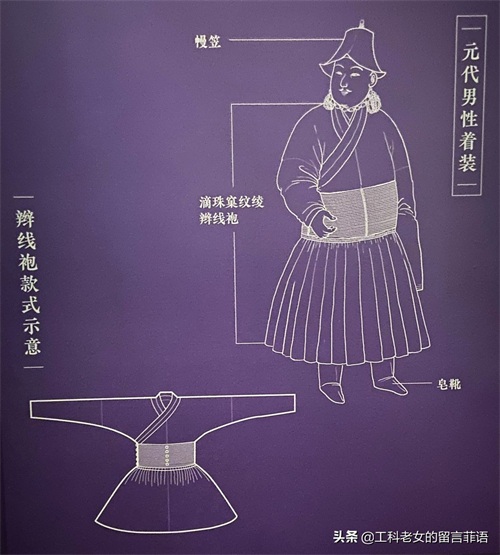 服装:元代男子穿的交领窄袖长袍常在腰间打细褶,用红、紫色帛拈成线横向缝纳,使腰间紧束,以便弓马,称辫线袄子。还有衣服上部前后缀以方形图饰的,名“胸背”,实为明代官服补子的前身。蒙古贵族女性多穿传统的宽大袍服,也称“大袖衣”,袖口收窄,长曳地。民间多着团衫,汉族女性则多循中原裙衫旧制。