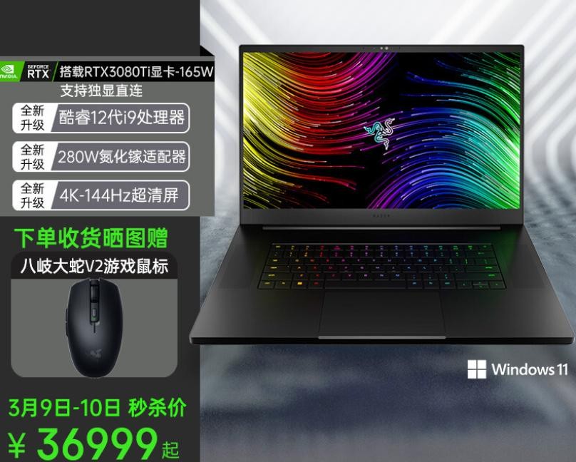 这就是雷蛇灵刃17 2022款,采用的就是4K分辨率144Hz刷新率的超清屏。大家也看到了清晰度是上来了,刷新率也下来了,也许也是考虑到4K分辨率下再上高刷GPU会负担过重,影响游戏体验。而同样CPU和GPU配置下比Alienware x15 R2 2022款都贵,要36999。这样一比ROG幻16的性价比是不是就出来了?