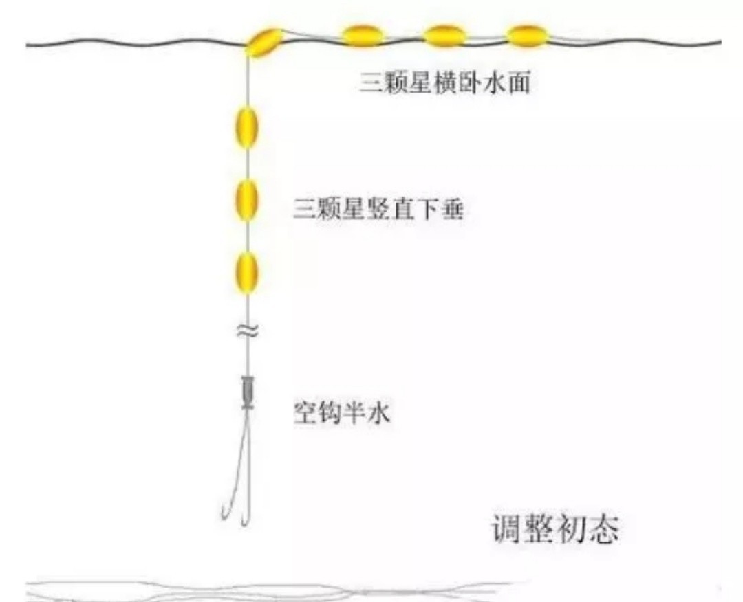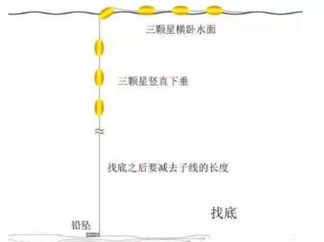 找底也可以带钩挂铅找底,那就不需要减子线长度了。接着要把七颗星整体下移10~20厘米 (确保双钩离底,即“半水”)。空钩半水(或无钩半水)调整铅皮,调整到第四颗星倾斜浮在水面的状态。此时水中三颗星基本是竖直下垂的状态。初态调整完 毕。