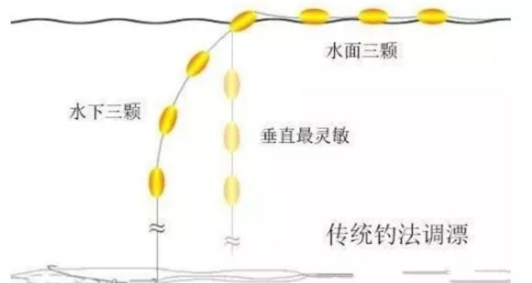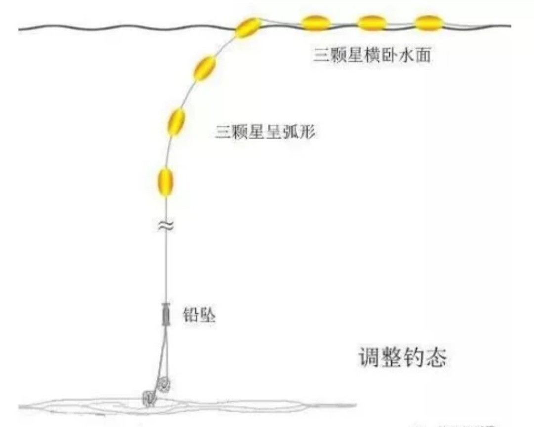 调整七星漂的位置,使中间一颗星旗号斜卧水面,水下三颗星,水上横卧三颗星。水下三颗星呈一定弧度(七颗星整体上移弧度大,整体下 移弧度小)。每颗星的间距根据目标与的大小调整,鱼大间距远,鱼小间距近。灵敏程度的调节是调节水下三颗星主线的弯曲程度。弯曲的弧度越大越钝,竖直下垂 最灵敏。