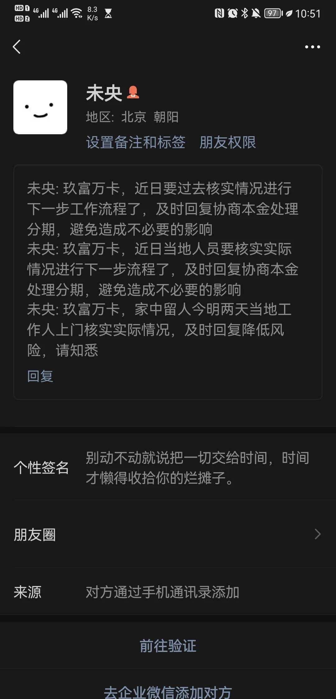 最近一直被一个陌生人添加好友,说要到家里外访,我欠该平台980元,该平台扣我保险费2400元,隔三差五加我微信要外访,之前也协商过,把保费退我,我一次结清,可是不可以,我就不明白了,为什么还有加我?能不能让我好好赚钱了。