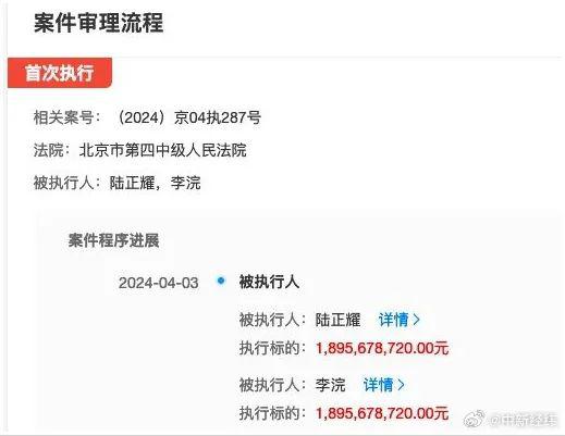 4 月 7 日,据天眼查法律诉讼信息显示,陆正耀及其合作人李浣被北京市第四中级人民法院列为被执行人,执行标的高达 18.9 亿余元。目前尚未披露此次强制执行的具体原因。