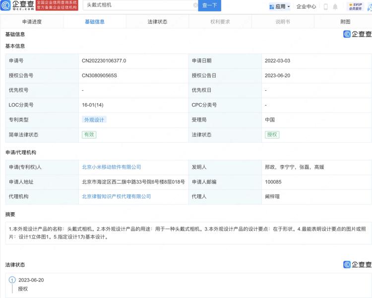 小米新专利头戴式相机获授权,为米家眼镜相机外观