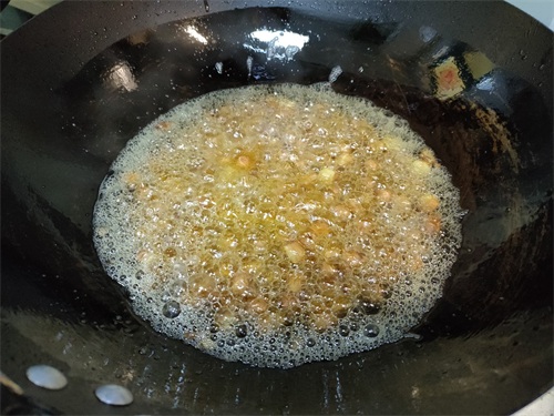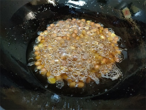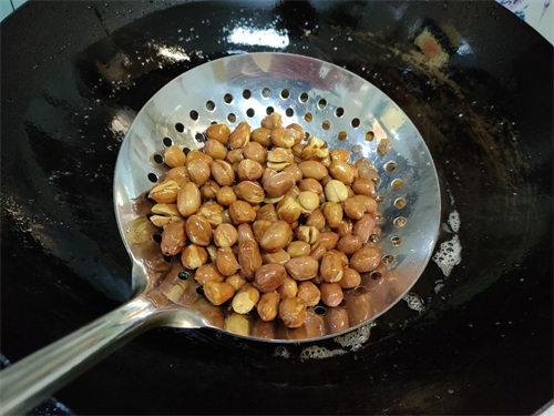 3、炸花生米的过程中要用勺子不停地搅动,使花生米均匀受热。