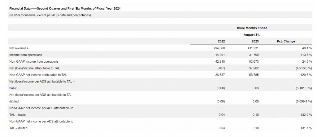 芥末堆文 10 月 26 日,好未来 ( NYSE:TAL ) 公布其截至 2023 年 8 月 31 日的 2024 财年第二季度未经审计财务报告。2024 年 Q2,好未来净收入 4.119 亿美元,上年同期净收入为 2.941 亿美元,同比涨幅为 40.1%。经营利润从上年同期的 1489.1 万美元上升到 3179 万美元,同比涨幅为 113.5%。
