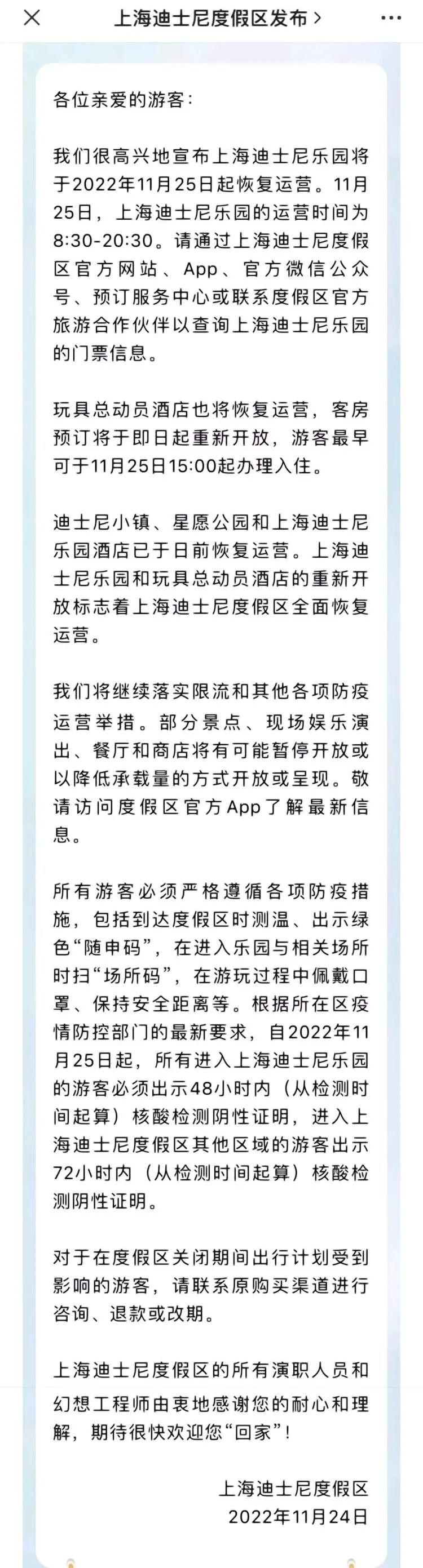 上海迪士尼度假区 11 月 24 日上午发布,上海迪士尼乐园将于 2022 年 11 月 25 日起恢复运营。11 月 25 日,上海迪士尼乐园的运营时间为 8:30-20:30。游客可以通过上海迪士尼度假区官方网站、App、官方微信公众号、预订服务中心或联系度假区官方旅游合作伙伴以查询上海迪士尼乐园的门票信息。