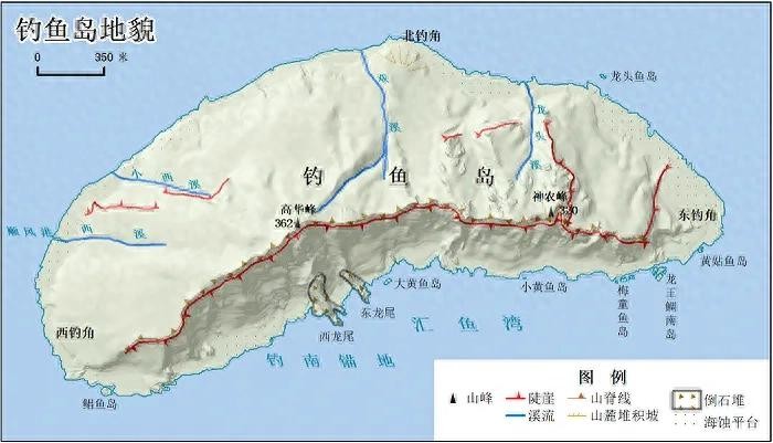 钓鱼岛地形陡峭,中央山脉山脊线呈东西走向,位于岛屿中南部,形成了北坡稍缓、南坡陡峭的地形格局。