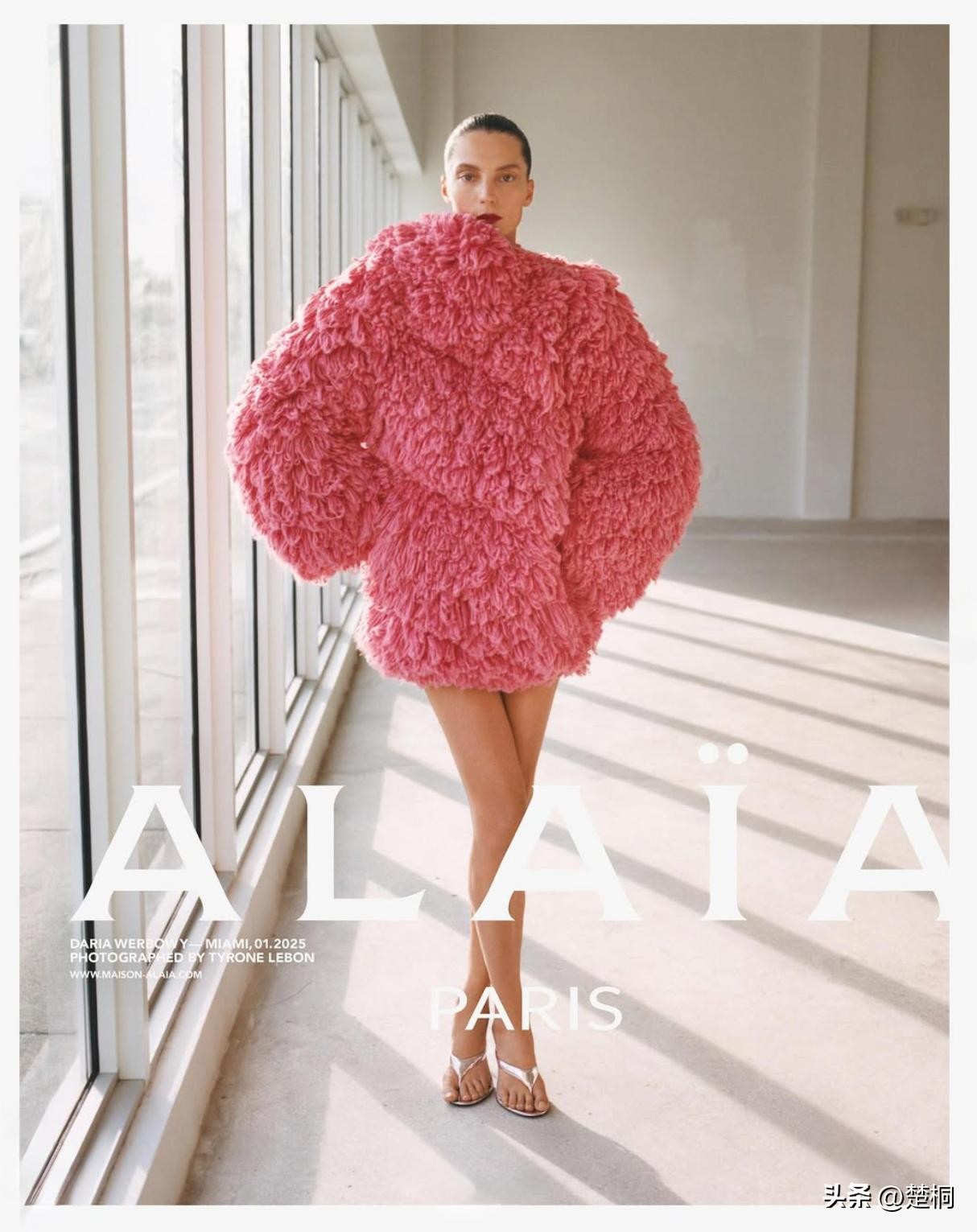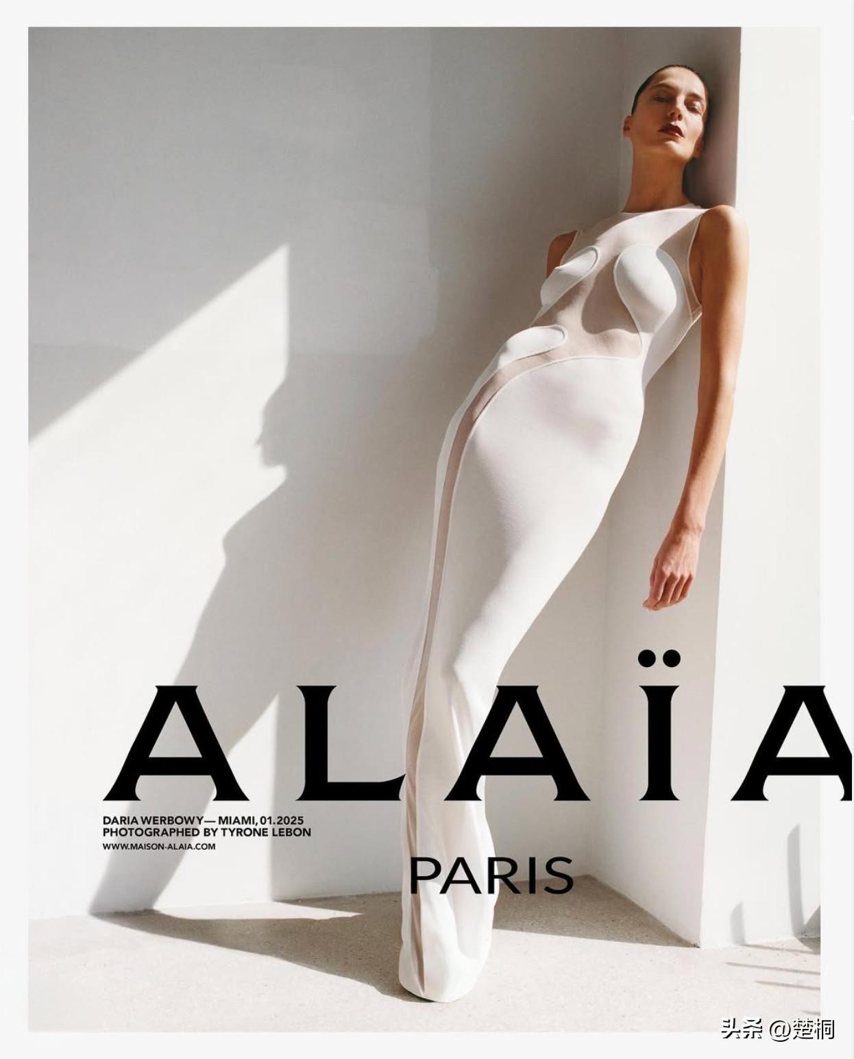 著名女性服饰品牌阿拉亚(Alaïa)发布了其 2025 春季广告大片,其中参演者是加拿大超模黛莉亚·维宝莉(Daria Werbowy),本次拍摄地为加州迈阿密。