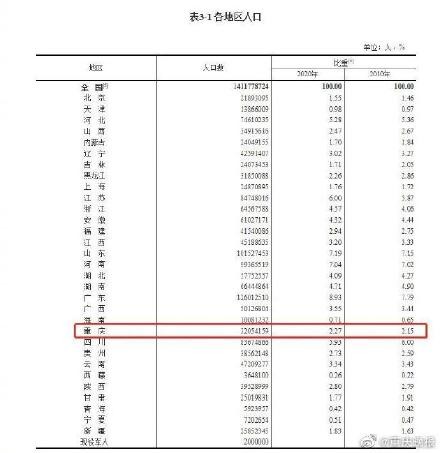 【最新数据:重庆人口数32054159人】根据国家统计局5月11日发布的第七次全国人口普查公报,截至2020年11月1日0时,重庆市人口总数为32054159人,占全国比重为2.27%,比2010年的2.15%略有上升。与2010年第六次全国人口普查相比,31个省份中,有25个省份人口增加。人口增长较多的5个省份依次为:广东、浙江、江苏、山东、河南,分别增加21709378人、10140697人、6088113人、5734388人、5341952人。(重庆日报)