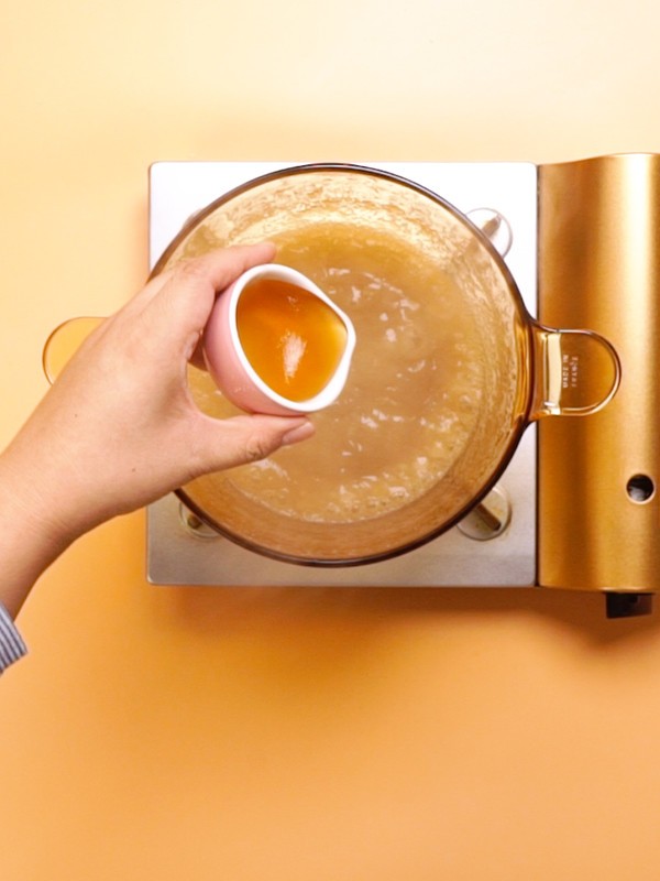 3. 锅中倒入梨汁,倒入枇杷汁液,大火煮沸