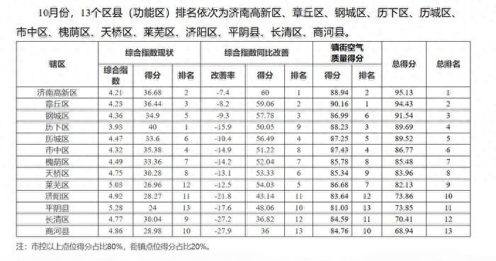 济南广电·天下泉城客户端11月19日讯 近日,济南市生态环境局发布10月份各区县(功能区)环境空气质量得分及排名,13个区县(功能区)排名依次为济南高新区、章丘区、钢城区、历下区、历城区、市中区、槐荫区、天桥区、莱芜区、济阳区、平阴县、长清区、商河县。